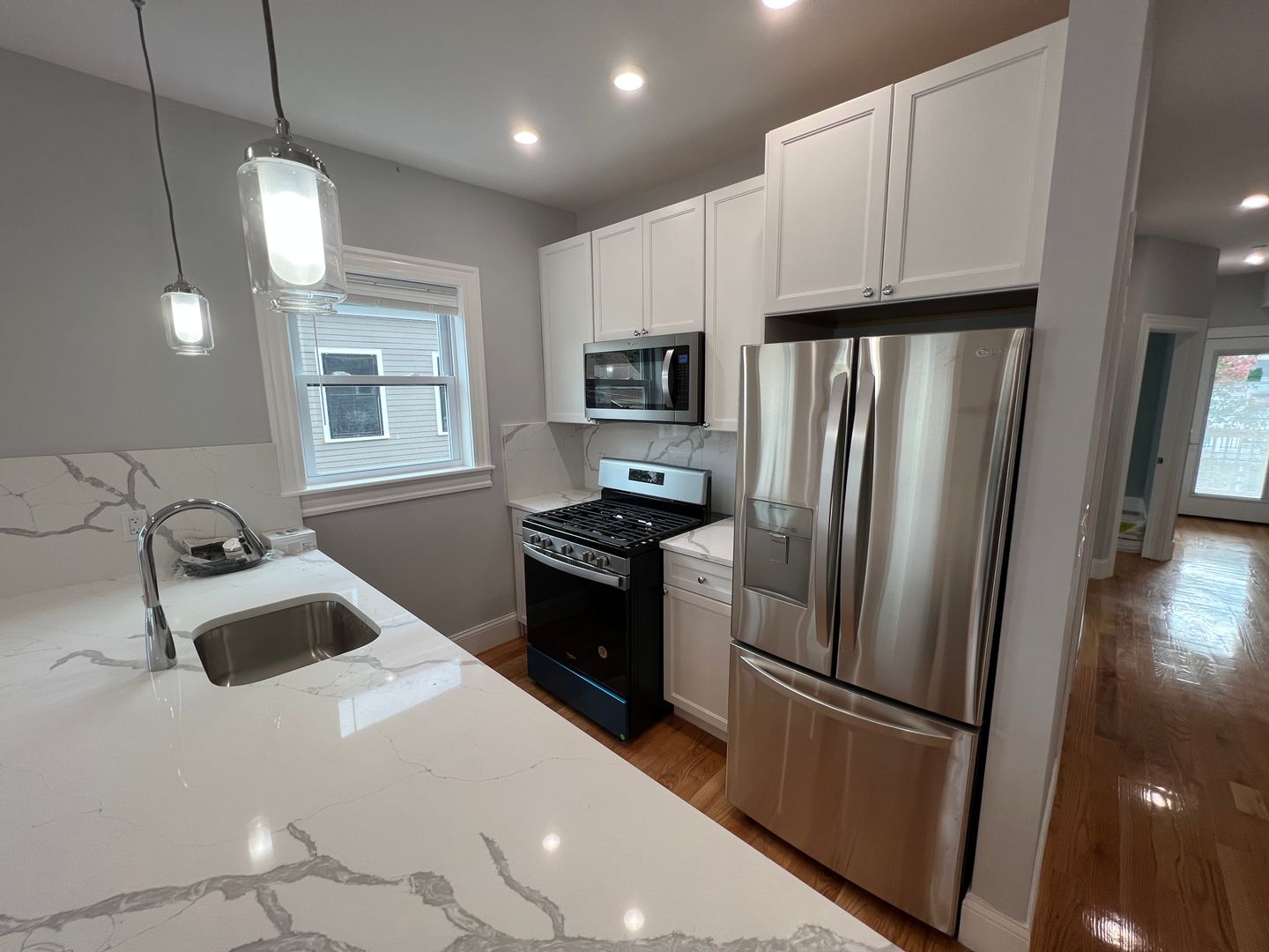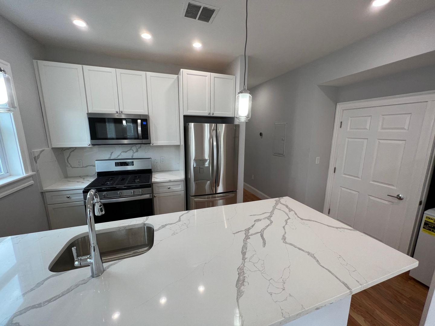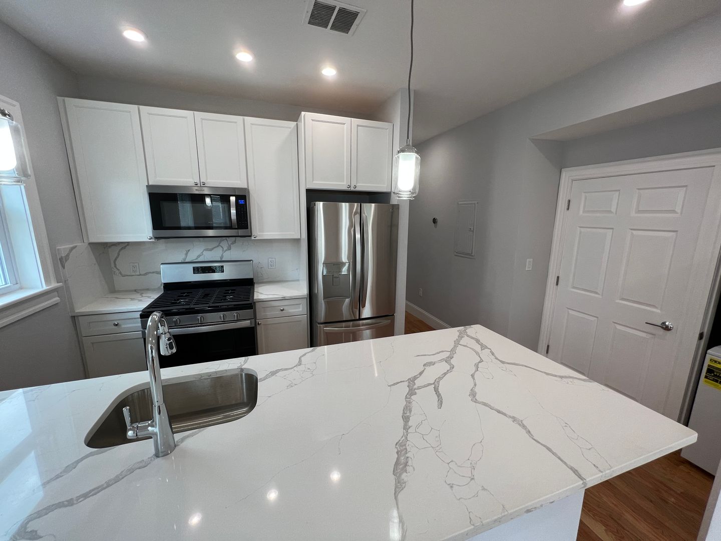 Modern kitchen with white granite counters and stainless-steel appliances.